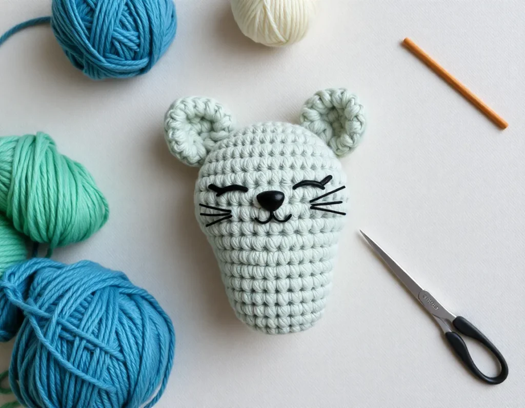 - Orejas: Con hilo rosa y gris, teje pequeños triángulos en punto bajo, de unos 2-3 cm de base y altura. Rellena ligeramente y cose en la parte superior de la cabeza.